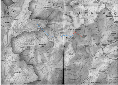 In blu la salita al Timogno, in rosso la discesa alla Baita Alta Rigada (1807 m.s.l.m.) |