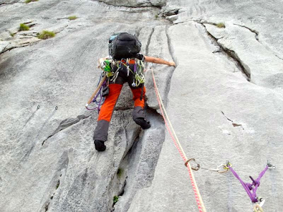 Discesa: Vi sono due possibilità di discesa. La prima calarsi in corda doppia lungo la via appena fatta (Utilizzando due mezze corde si riesce a fare solo due calate).